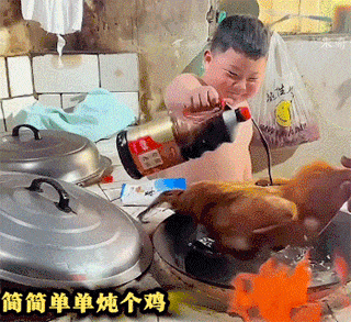 小朋友在家简简单单炖活鸡,不忘放料盖锅盖