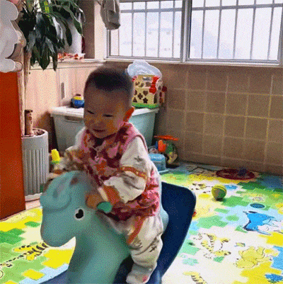 小娃娃骑木马玩得嗨,一不小心就翻车