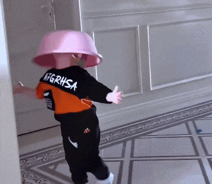 宝宝把盆子盖在头上玩,走路撞墙摔倒在地