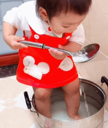 小宝宝站在锅里拿大勺舀粥喝
