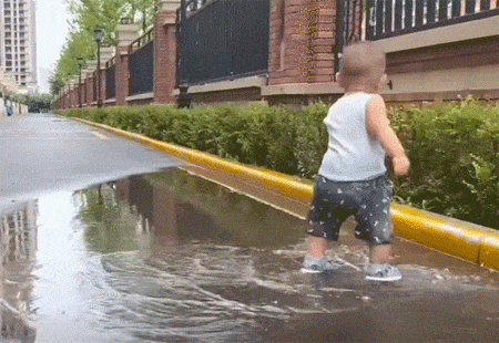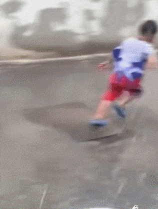 小朋友在雨中狂奔,没想到鞋子滑到了小腿上