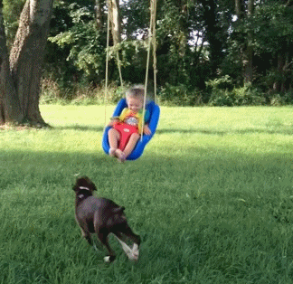狗狗帮助小主人荡秋千玩耍
