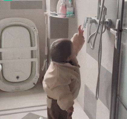 小宝贝跑到厕所开淋浴花洒,结果把自己淋了个落汤鸡
