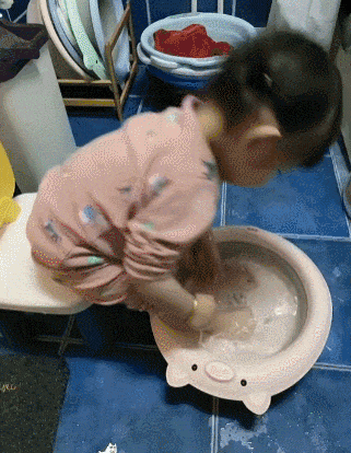坐在凳子上洗脚的小女孩摔了个四脚朝天