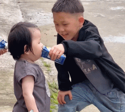 哥哥好心给妹妹喝牛奶,没想到全流到了衣服上