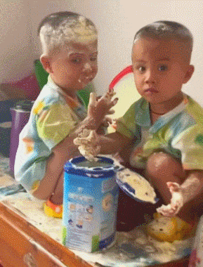 兄弟俩饿了,打开盖子一起抓奶粉吃