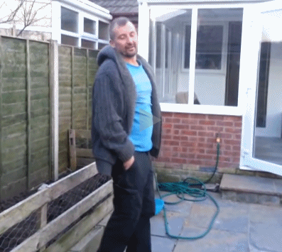 大叔后退时不注意摔进木槽里了