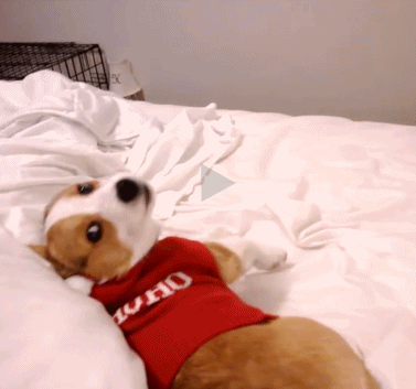 兴奋的狗狗在床上一个翻滚摔到床下去了