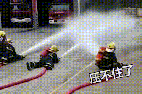 消防员练习喷水灭火,水压太大压不住了,真是可爱又…