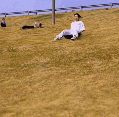 妹子在草地上开心玩滑滑梯,只是有点费屁股