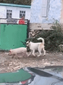 狗狗咬着猪猪的尾巴不松开