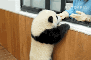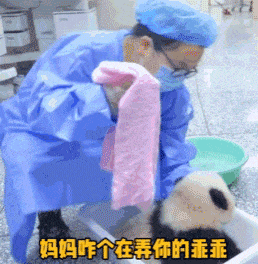 饲养员把熊猫漂亮的脸蛋擦干净