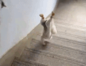 狗狗表演倒立着跑下楼梯