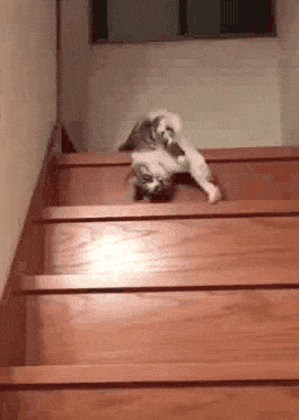 贴着楼梯台阶往下滑动的喵星人,看起来很好玩的样子