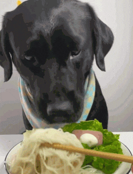 大口吃面吃香肠的狗儿