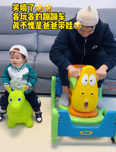 爸爸在家带娃很嗨皮,各玩各的蹦蹦车