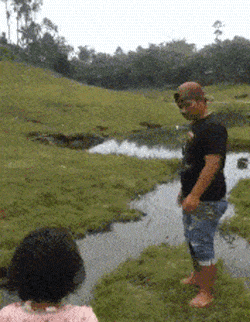 把宝宝抱起扔到水沟对面,自己却一头栽进了水里