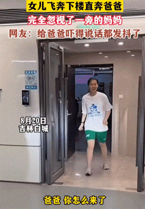 女儿飞奔下楼直奔爸爸,完全忽视了一旁等待的妈妈