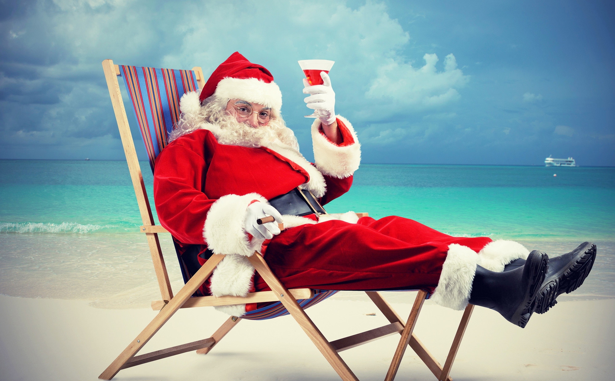 圣诞老人悠闲的坐在海边喝酒过圣诞