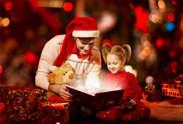 戴着圣诞帽的爸爸陪女儿一起读书