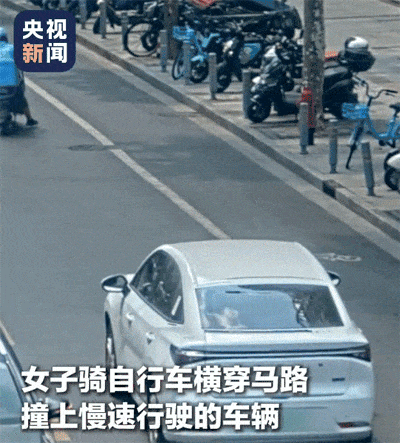 女子骑自行车横穿马路被撞倒,希望下次再别这样了