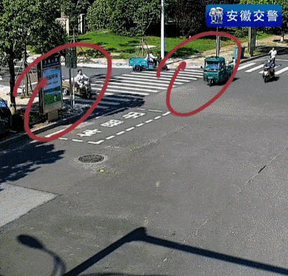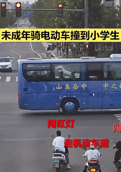 不戴头盔还左右摇晃的未成年人骑电动车闯红灯,撞到…