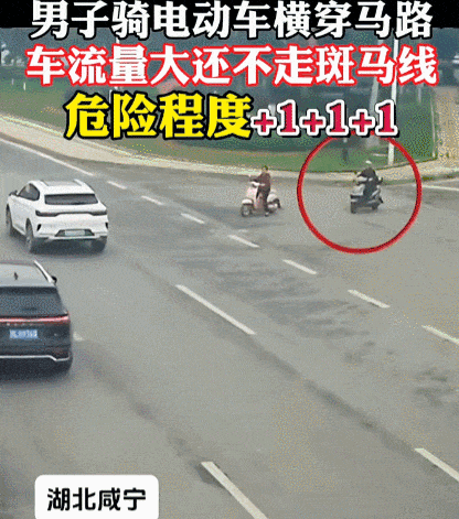 男子骑电动车横穿马路,车流量大还不走斑马线