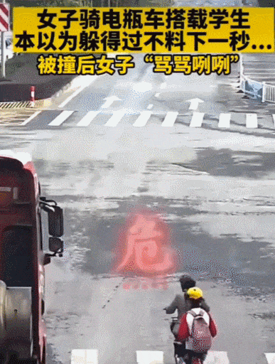 女子骑电动车搭载学生看见大货车不躲避,没想到被撞了