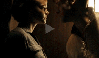 女主被男主角推倒在床,四目相对