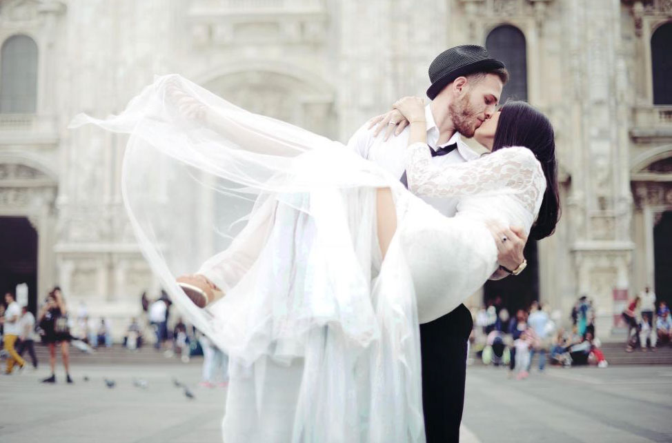 在大街上抱起新娘亲嘴的新郎