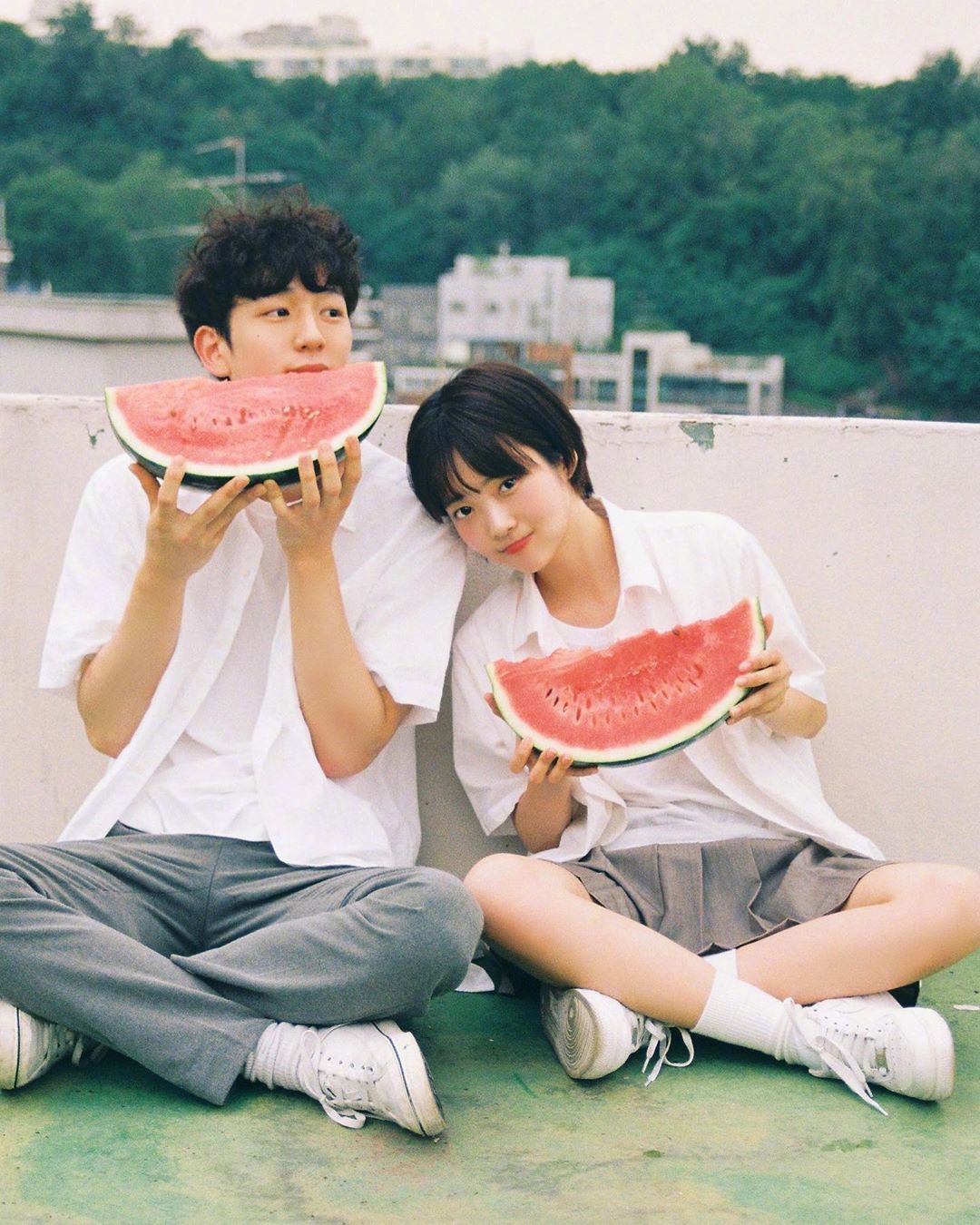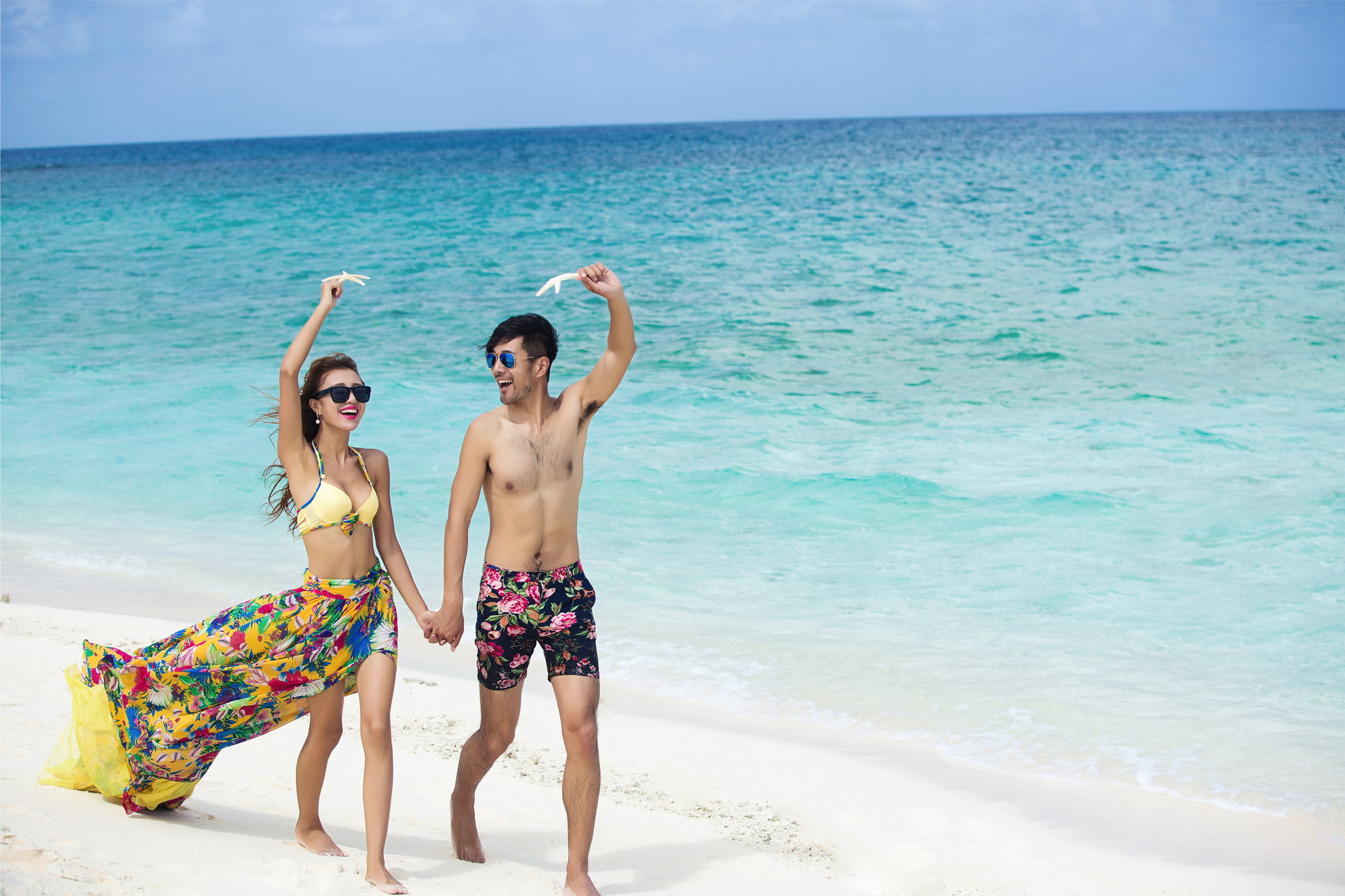 踩在沙滩上转头微笑的恋人,脸上写满了幸福