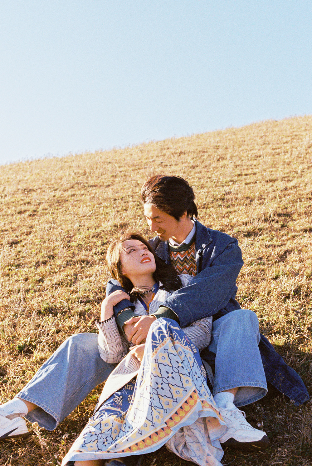 坐在草地上的一对恋人
