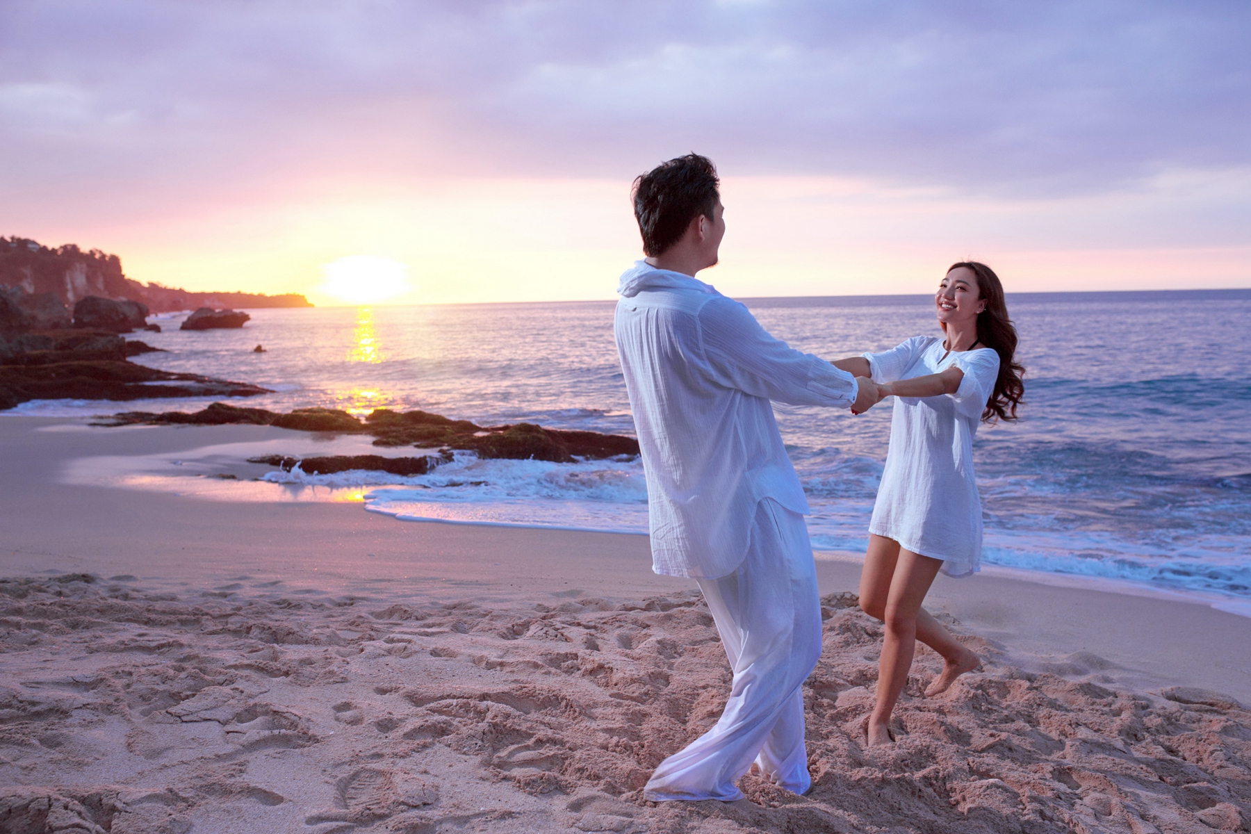 沙滩上情侣拉手转圈圈的幸福时刻