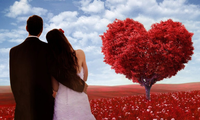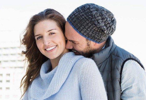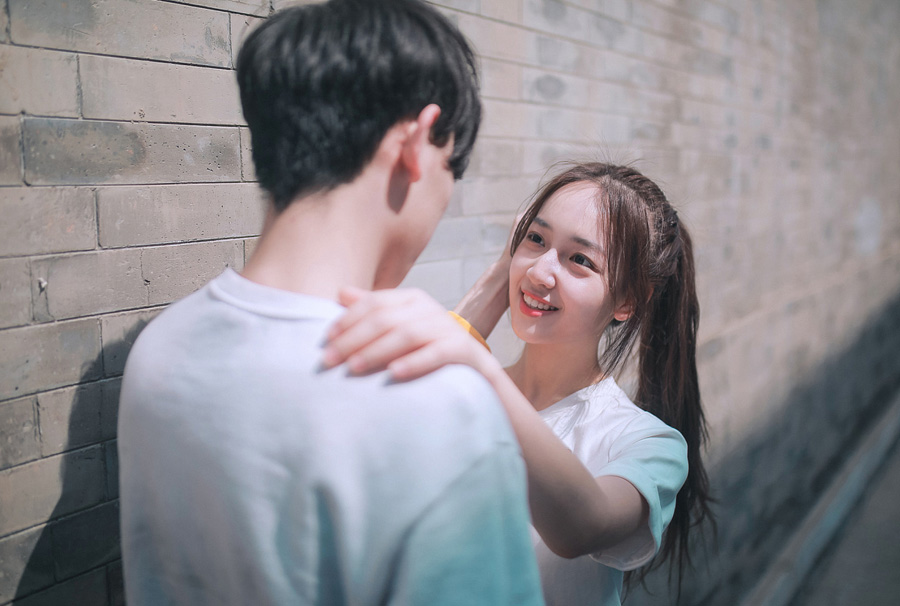 美女从身后望着自己的男人,脸上洋溢着幸福的微笑