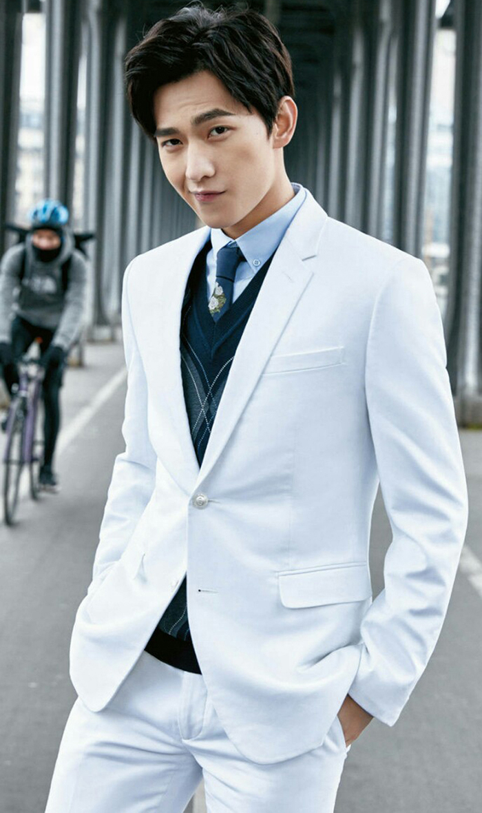 穿白色西服的俏皮男生