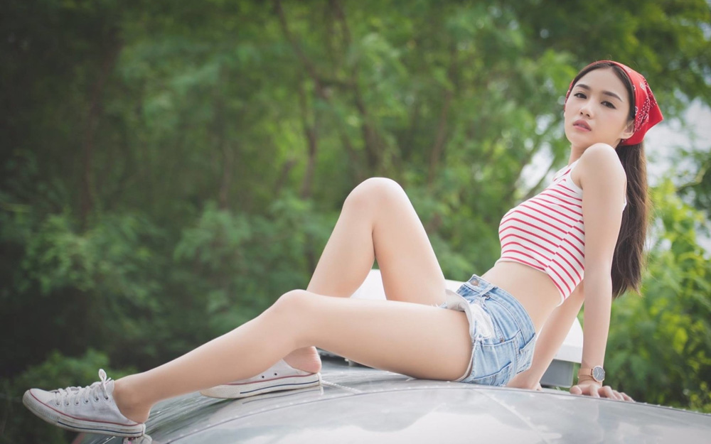 坐在车顶秀美腿的女人
