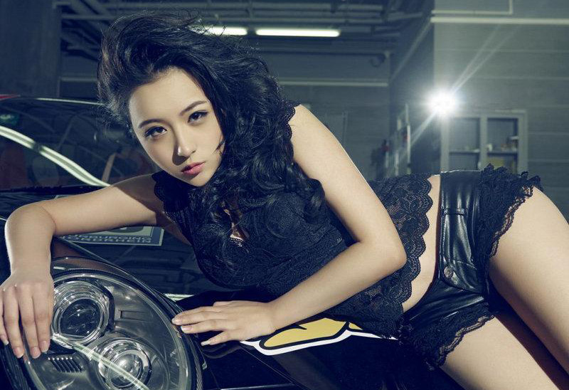 爬在车身上的美丽车模
