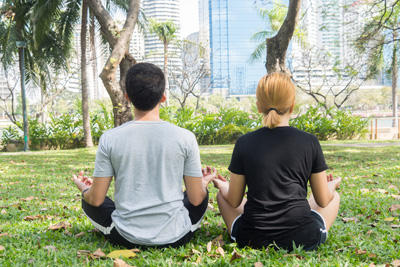 一对情侣在公园里练静坐,一起修身养性