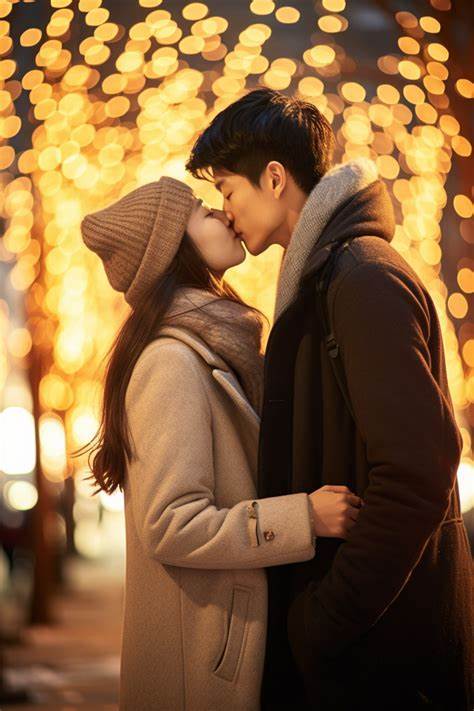 俊男美女在路灯下碰鼻子秀恩爱