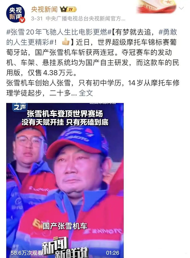 张雪机车(ZXMOTO) 是 2024 年在重庆成立的国产高性能摩托车品牌,创始人张雪,核心优势为全栈自研 + 赛事反哺民用,2026 年凭 820RR-RS 在 WSBK 夺冠一战成名。