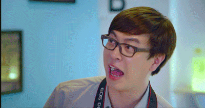 在帅哥面前张着嘴哈哈大笑的眼镜男