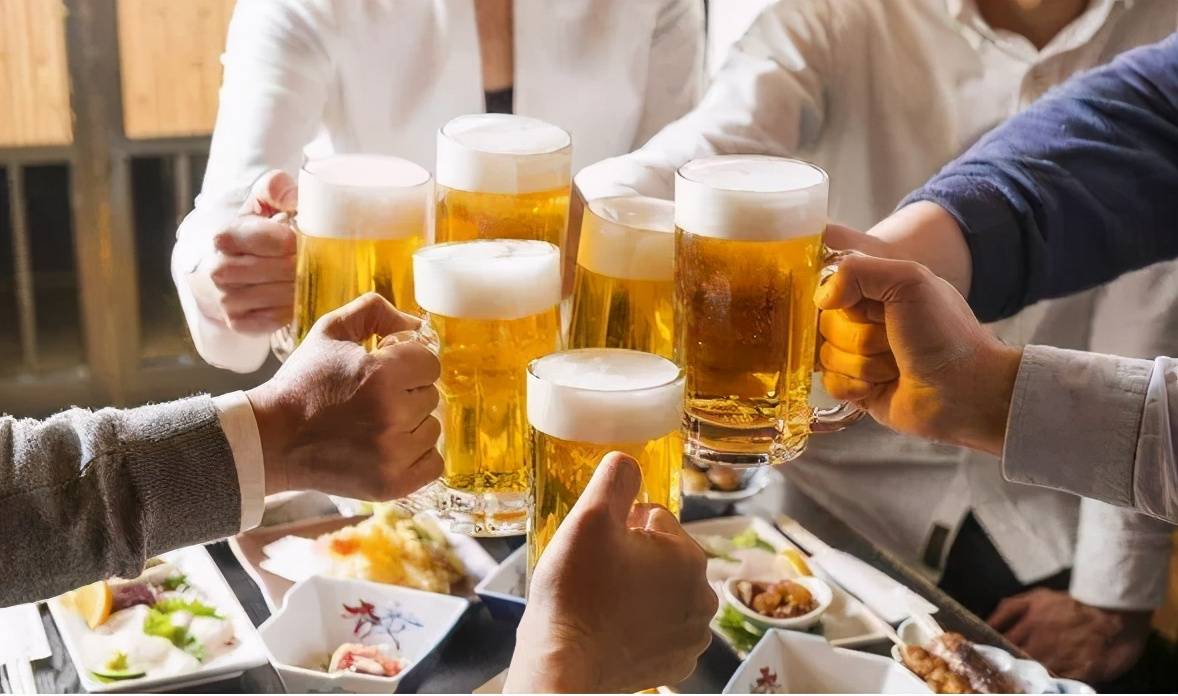 一群人举起大大的啤酒杯碰杯,共祝生意兴隆