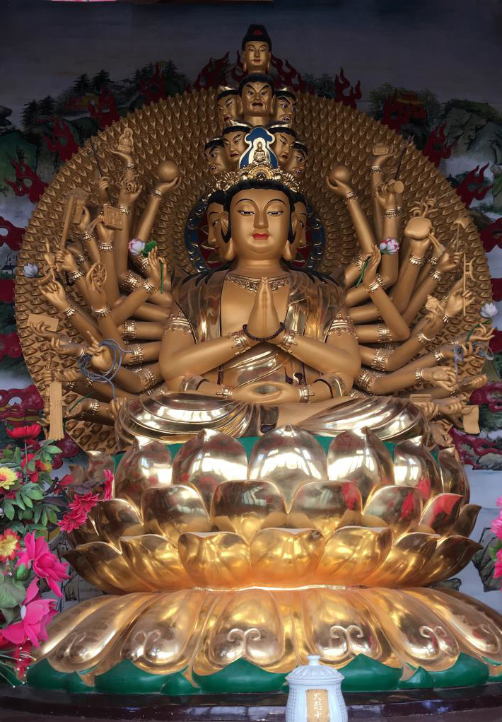 寺庙里的绘彩纯铜千手观音佛像
